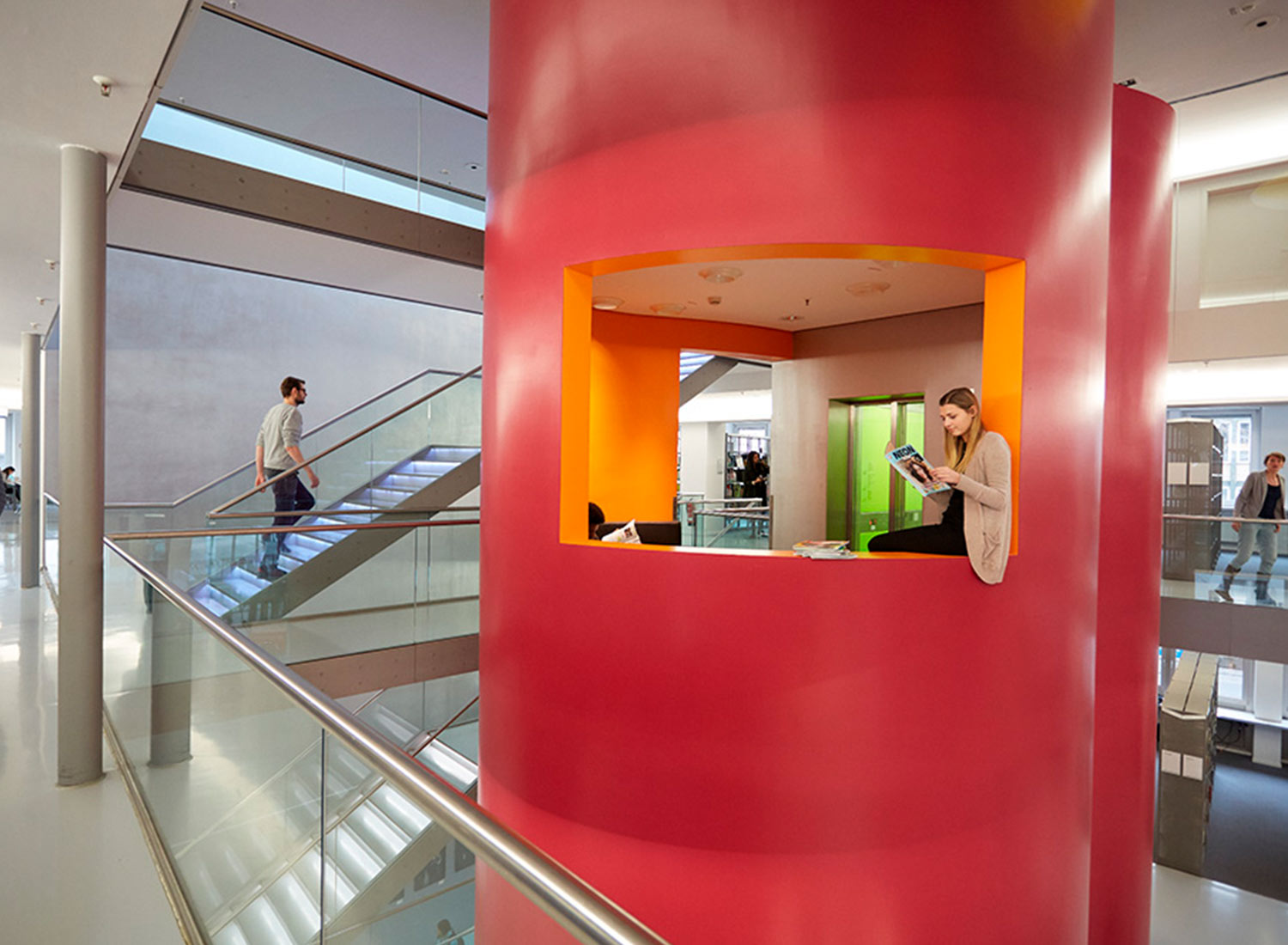 Together, the Central Library and the music library at Hasengasse include 186,000 items and were visited over 515,000 times in 2017. Since moving to Hasengasse in 2007, the Central Library has been an indispensable cultural meeting place as well as a generously designed learning and event venue to the whole community. Before moving in, the building of the former central bank was completely renovated and modernized. True to the motto “We open spaces and horizons,” a fresh, bright, modern interior concept was created, which, according to their brochure, functions as an “oasis in the hectic pace of everyday life and as a meeting place for encounters and dialogue.” During the renovation, the library technology was updated and the collection was converted to RFID.