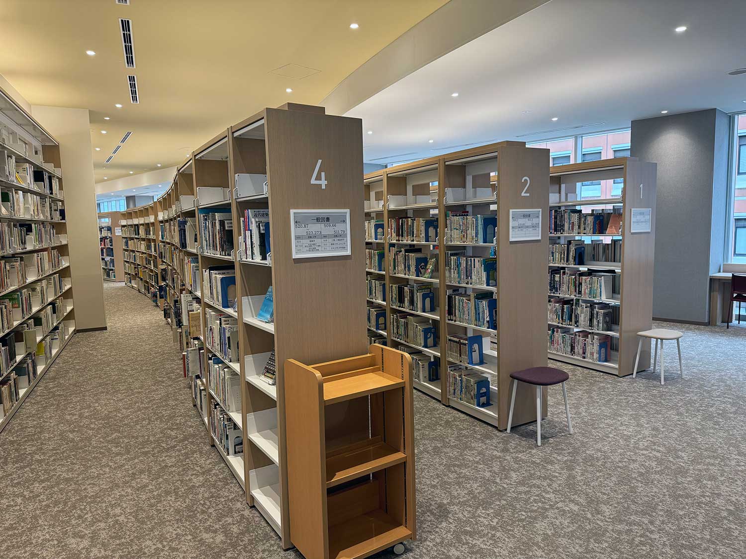 図書の貸出しや返却手続きが便利にできるように、4階から6階までの各フロアにBibliotheca社製のUHF対応の自動貸出返却機を設置しています。複数の図書を瞬時に読み取り、画面に出てきたリストを確認してタップするだけで簡単に貸出しも返却もできるため、現在では貸出の大半は自動貸出機が利用され、カウンター業務の軽減に役立っています。貸出だけならスマホアプリを利用した手続き方法も導入しました。退館の際はBibliotheca社製のBDS装置が未手続の図書があれば感知して、カウンタースタッフに知らせるとともに本を特定することもできます。