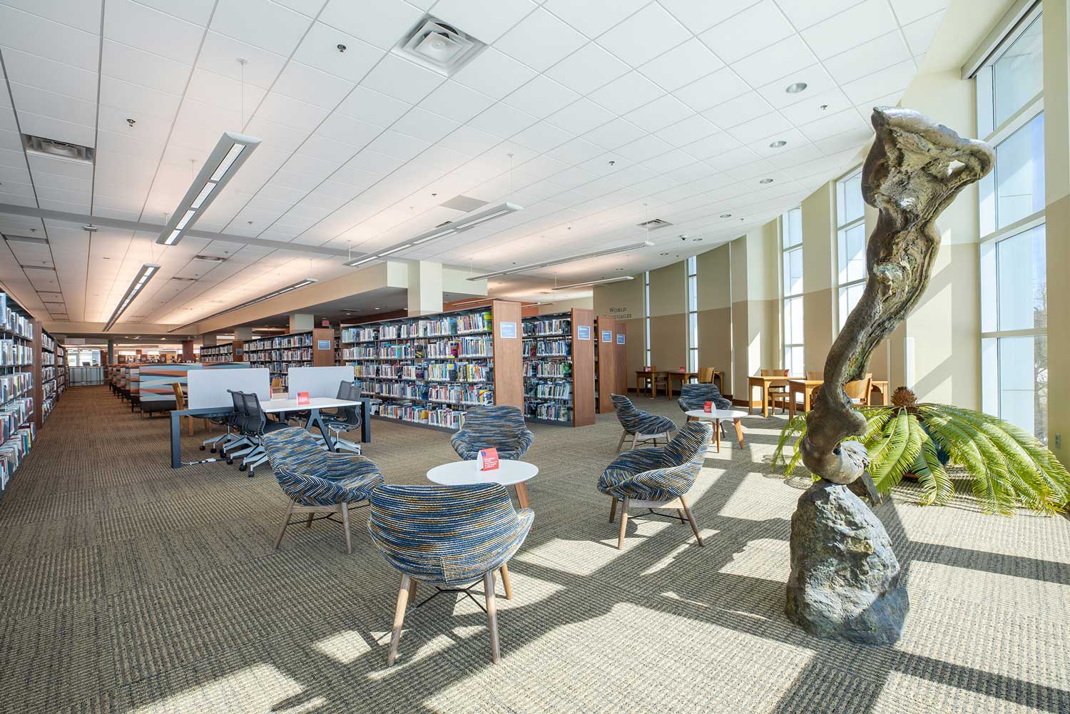 Fayetteville’s 96,500 residents are served by just one library, but what a library it is. Despite the global pandemic, in January 2021, Fayetteville Public Library completed a 100,000 sq. ft. expansion, creating a stunning 190K sq. ft. facility. The library serves as an anchor for Fayetteville’s Arts Corridor – an ongoing city project which links several arts organizations via a walkable path called The Ramble.
