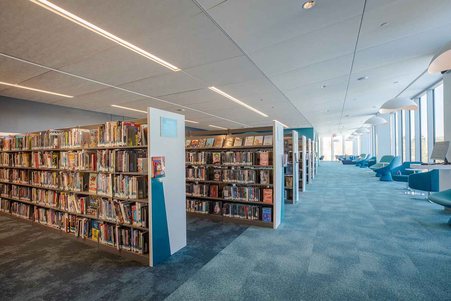 While the original library building offered one primary entrance, the expansion includes seven distinct entry and exit points located in key sections of the library. Each entrance is outfitted with Bibliotheca RFID gates and a selfCheck 1000, so patrons can easily borrow the materials they need and be on their way.